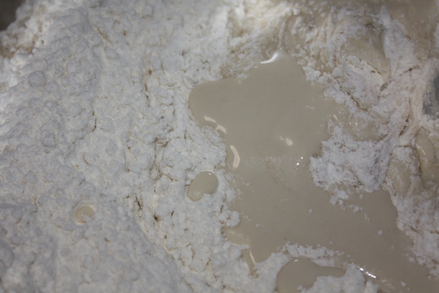 流しこんだ牛乳はすぐに小麦粉にしみこむのではなく、小麦粉の上を流れ落ちていきますよね。