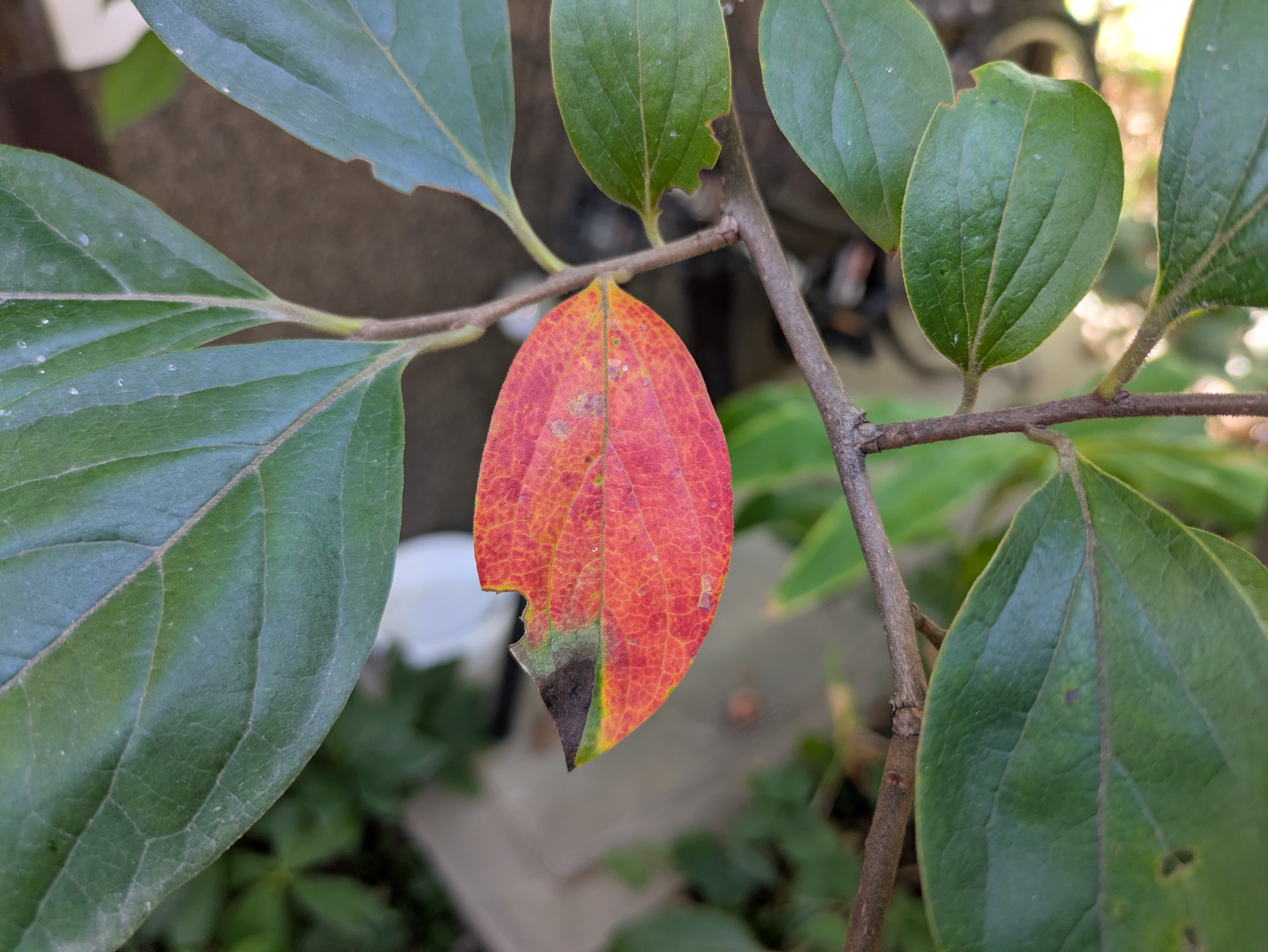 そして種から育てている柿の木も、一枚だけ赤く色づいた葉がありました。