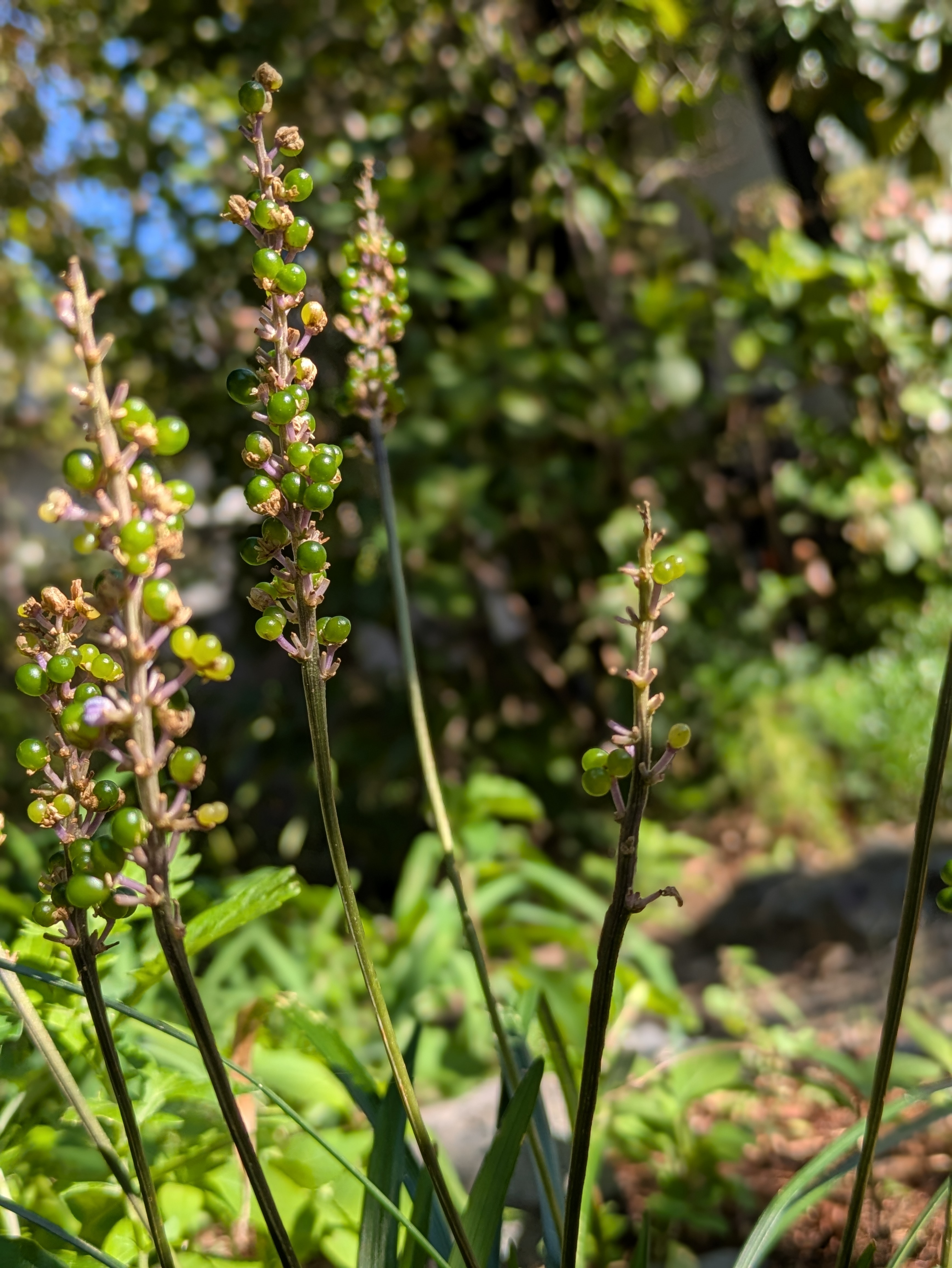 一息ついて庭を見回すと、先日まで花を咲かせていたヤブランが、いつの間にか実をつけていました。