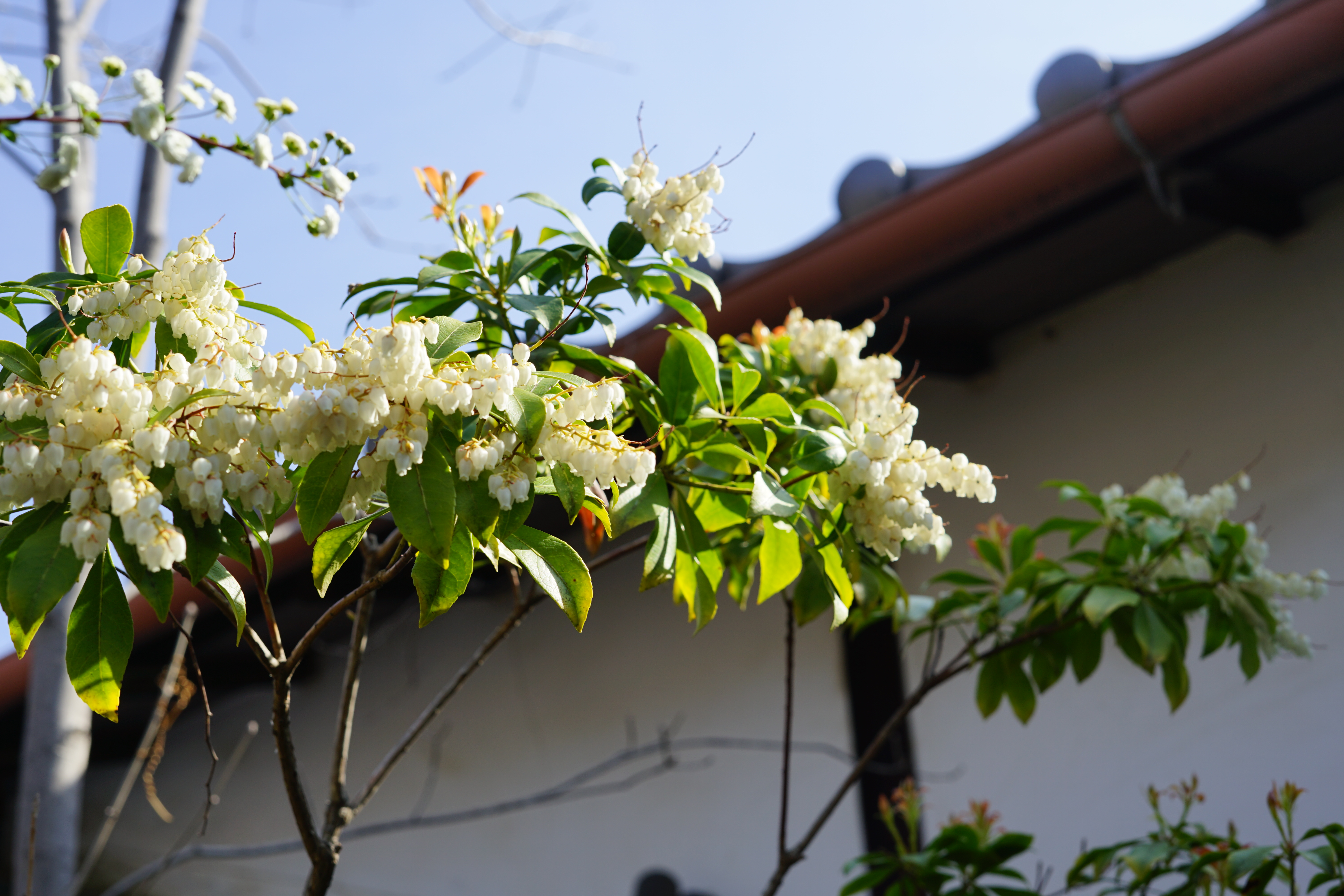 白い花がたわわに咲くアセビに…