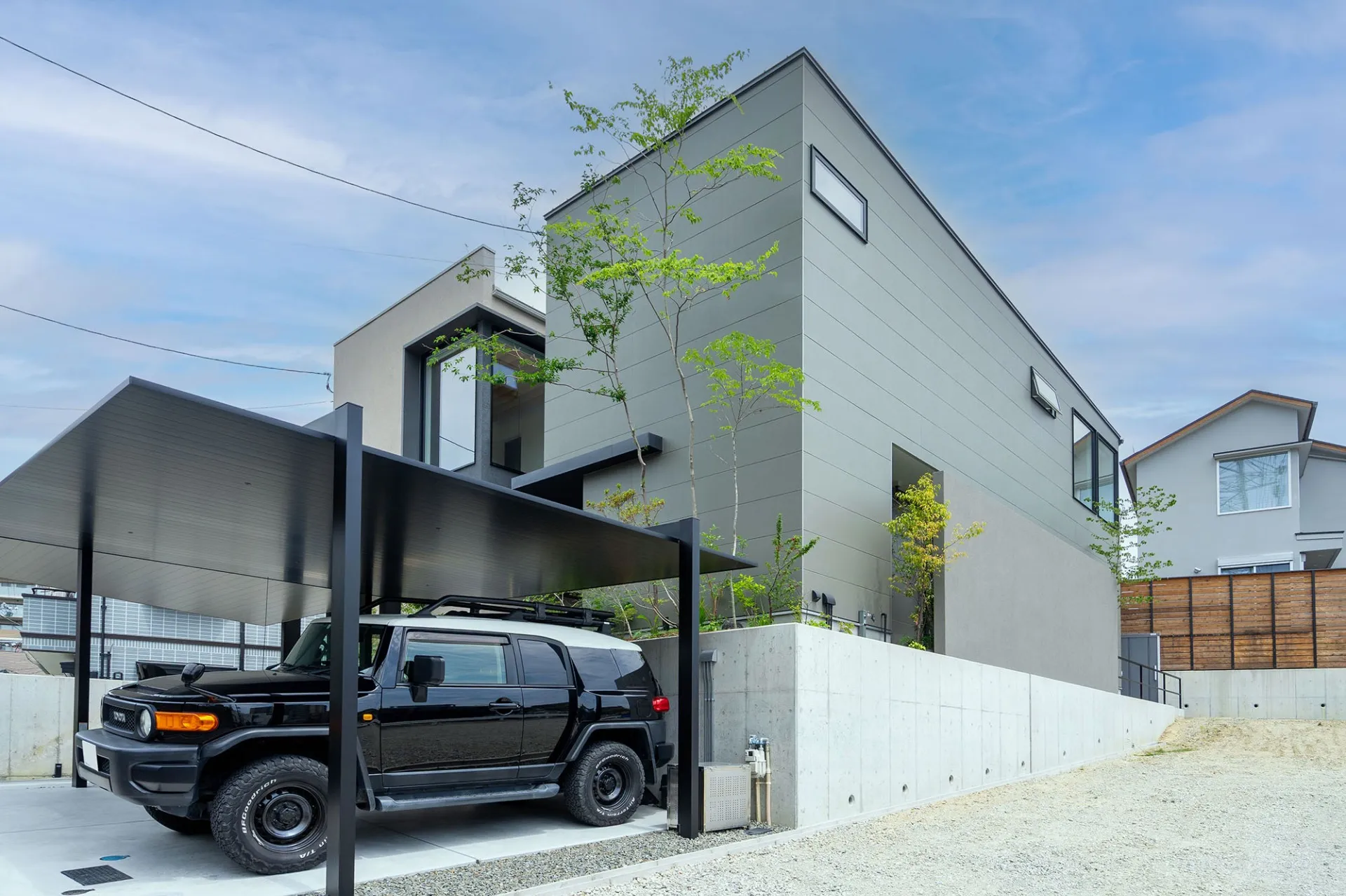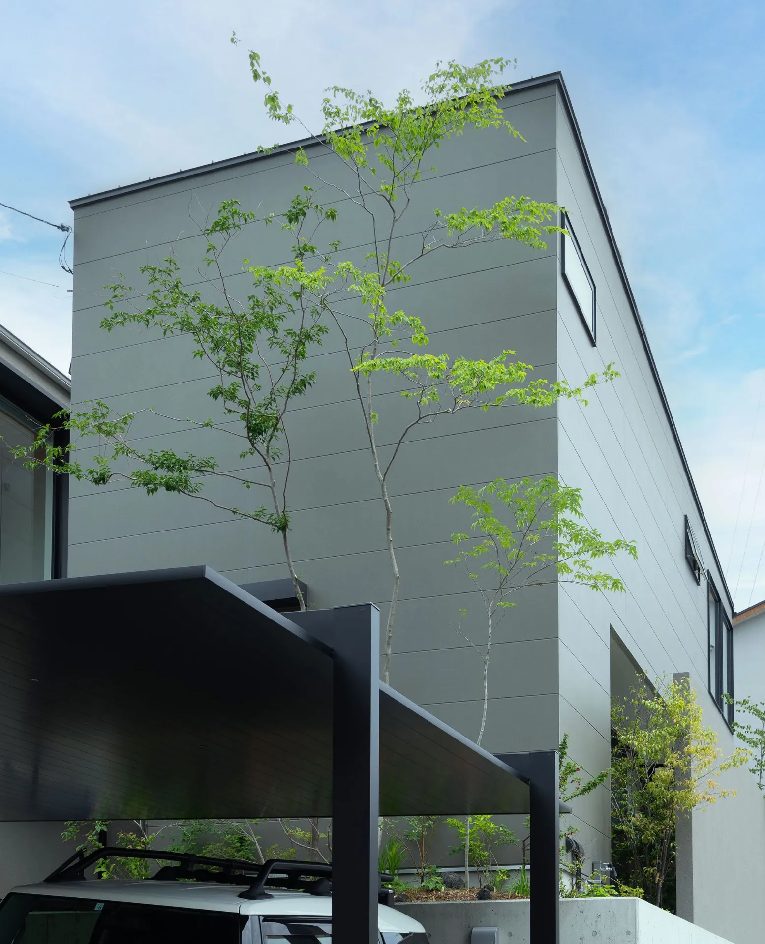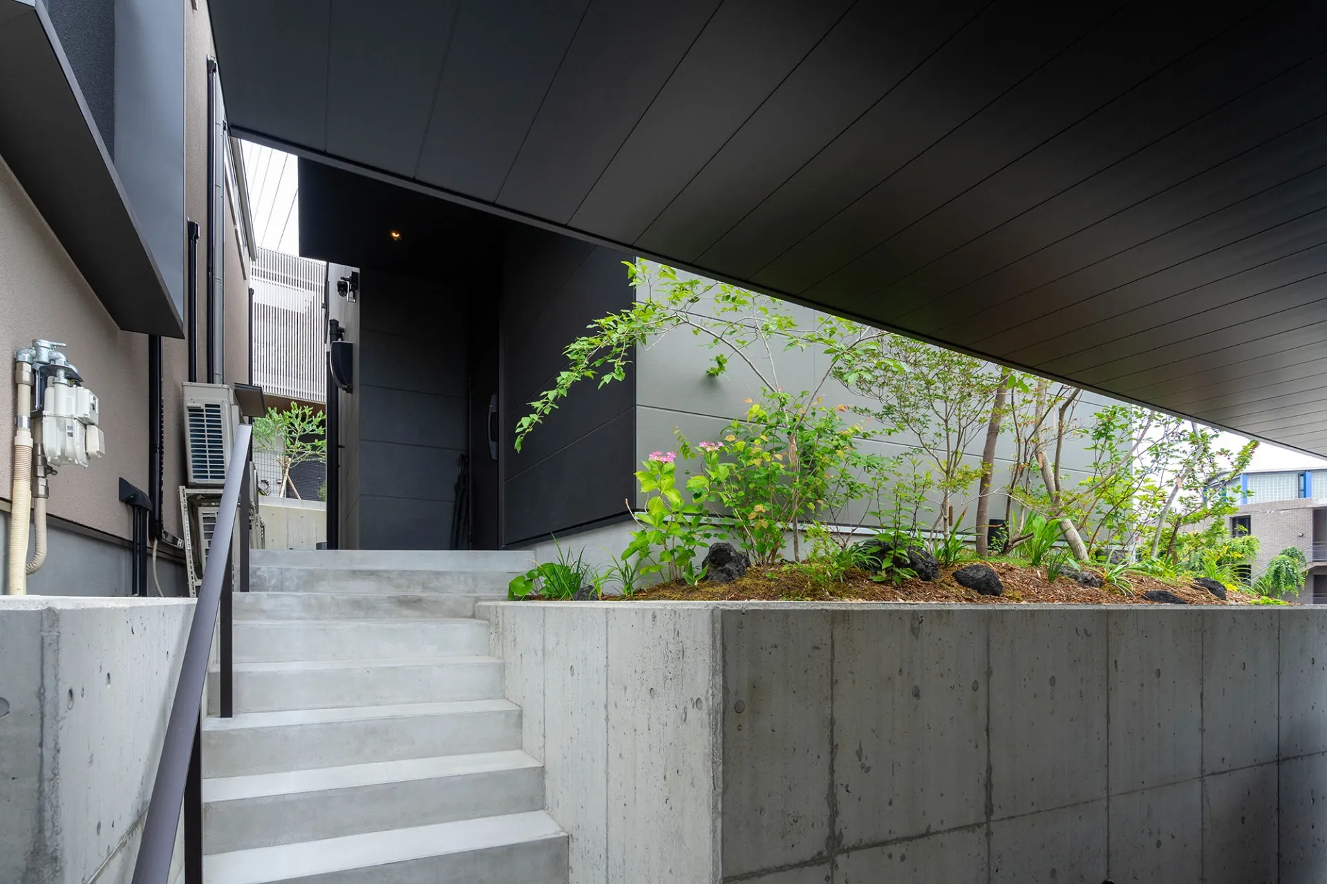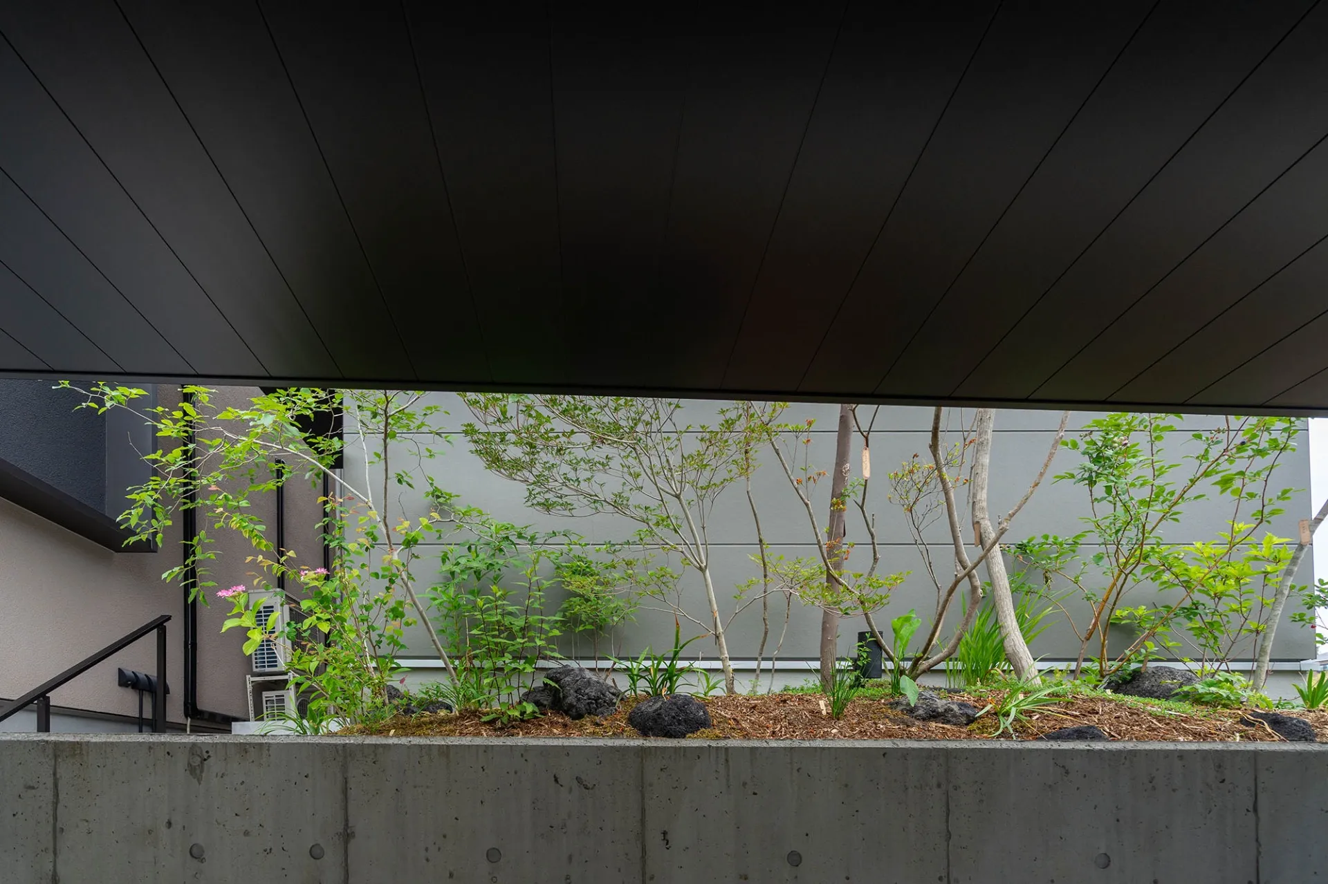 建物の正面には、建物の高さに合わせて樹高のある木を配置し、植栽と建築が互いを引き立て合うよう設計しました。 また、駐車場が植栽スペースよりも低い位置にあるため、下から草花や低木を見上げるような視点が生まれ、立体的な植栽の楽しみが広がります。 玄関アプローチや階段、駐車スペースなど、敷地内のさまざまな場所から植物が違った表情を見せてくれるよう、草花や低木を組み合わせて植栽しました。朝の出発時と夕方の帰宅時で、違う印象を味わえるのもこのお庭の魅力です。 さらに、建物の正面だけでなく、室内からも緑が感じられるよう、建物横にも植栽スペースを設けました。窓の高さに合わせて木を選び、室内にいながらも自然を身近に感じられるようにしています。